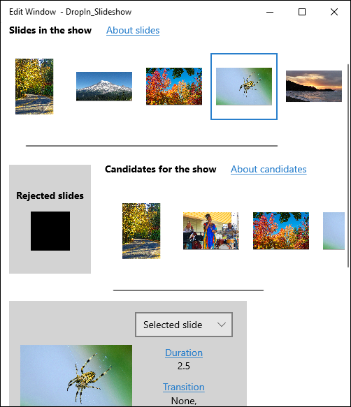 Below the slides is the second major area – a horizontal line of "Candidates." You will probably need to select the Candidates folder to make the Candidate images appear. (See the discussion of the "Choose folder" button below). The candidates may already be in the slideshow, or they may not. To add a candidate to the slideshow, just drag it from the Candidates area and drop it on one of the slides in the slideshow time line. The candidate will be added to the slides show after the slide where it was dropped. You can also use buttons to Send a selected candidate, or all the candidates, to slide show